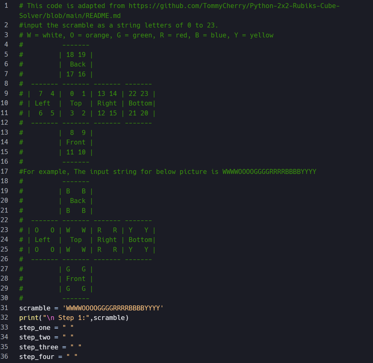 I worked on this project with my Mentor, Dr. Veny Liu, at the University of Hawaii West Oahu. It was my responsibility to identify and correct errors in the original source code that we found on GitHub. I then adapted and reorganized the Python code into a reliable 7-step solution process. I also tested the program to ensure that it worked on a variety of scrambles, not just simple variations.