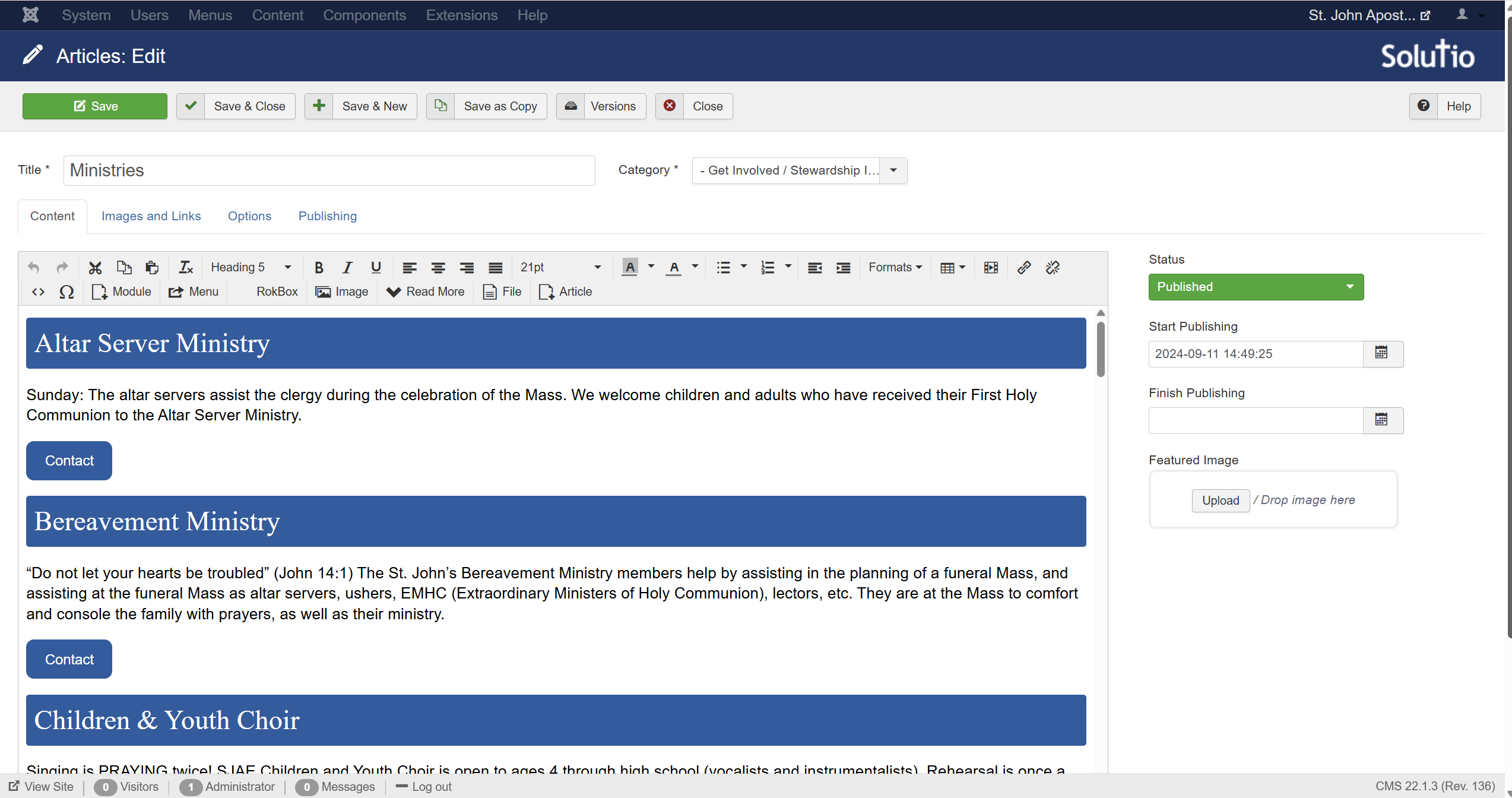 I recently worked as part of a team to design and build a website for Saint John Apostle and Evangelist Catholic Church. Our goal was to create a clear and easy-to-navigate site that would help parishioners find information and connect with ministries. We used Solutio Software, which is a company that builds templated, customizable websites for Catholic churches and dioceses. Together, we designed the website’s layout, tabs, and submenus.